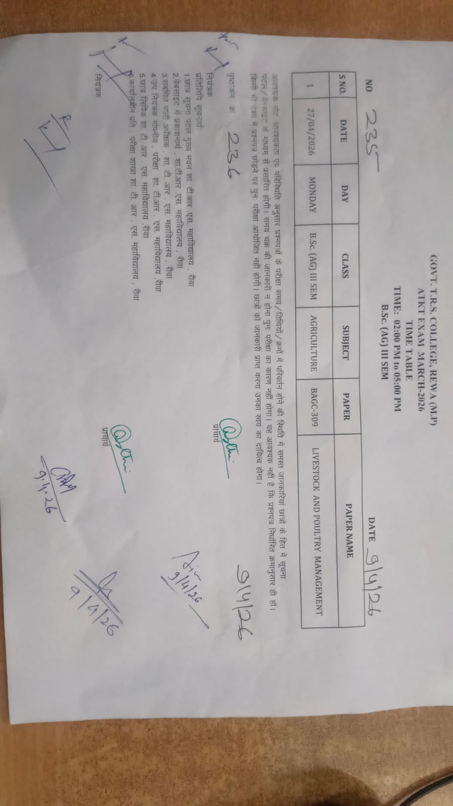 माननीय कलेक्टर महोदय के निर्देशानुसार दिनांक 31-03-2026 महावीर जयंती का अवकाश 30-03-2026 सोमवार, को किया गया है इस कारण से वार्षिक परीक्षा 2026, की दिनांक 30-03-2026 सोमवार की सभी परीक्षाएं निरस्त की जाती हैं | इस दिन होने वाले प्रश्न पत्र की परीक्षाओं के लिए पृथक से Time-Table जारी किया जायेगा |