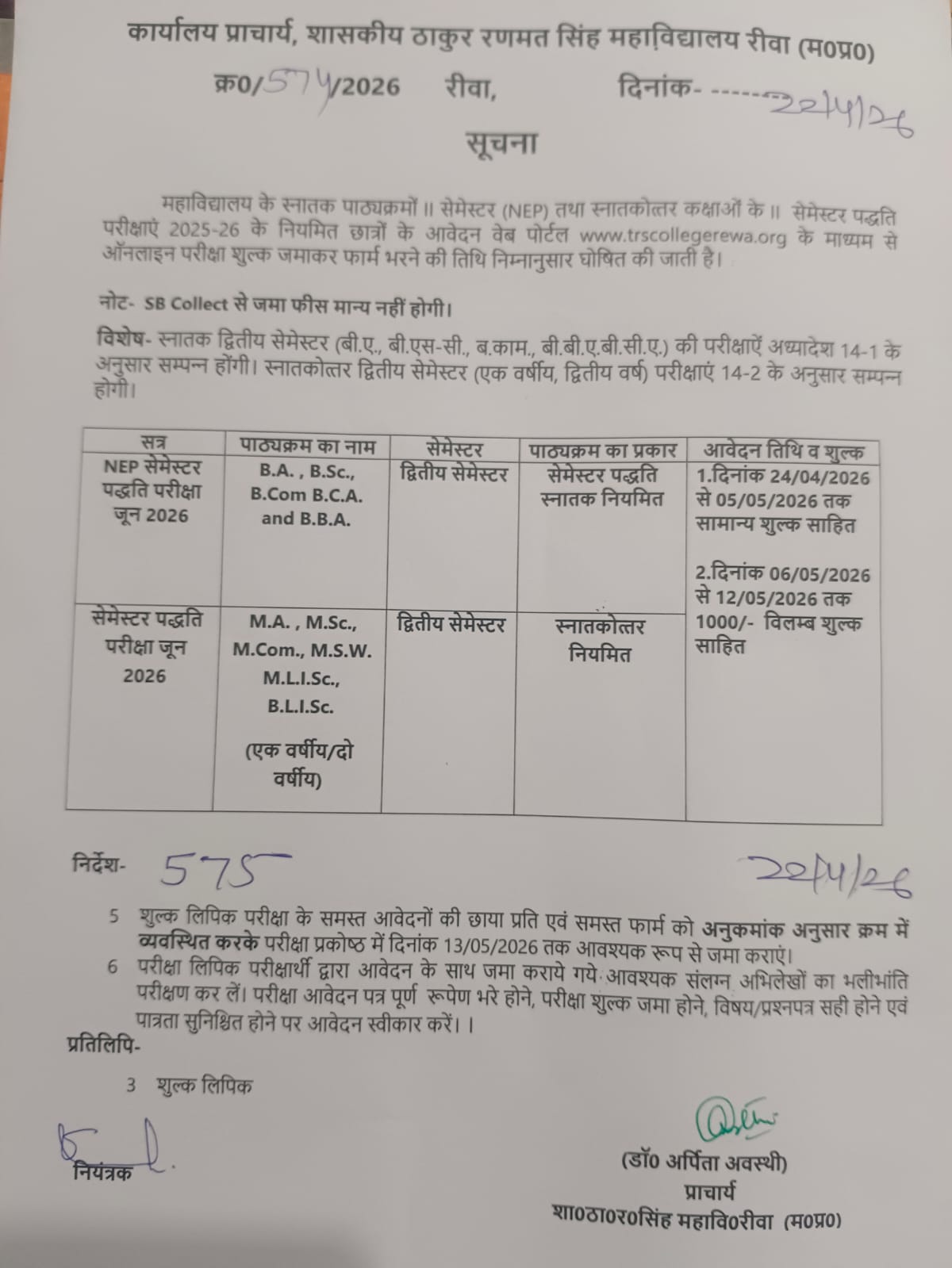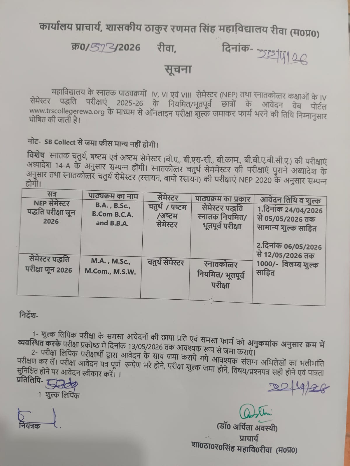 सेमेस्टर 3 5 7 का परीक्षा फार्म एवं फीस जमा करने की लिंक 18-11-2025 17:30 IST से चालू होगी तथा सेमेस्टर 1 की लिंक 20-11-2025 से चालू होगी ।