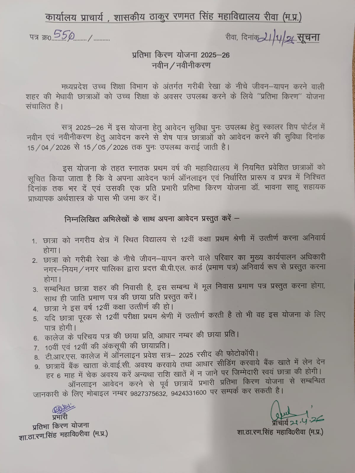 इस हेतु फॉर्म 6 ऑफलाइन भरने के लिए महाविद्यालय की वेबसाइट पर उपलब्ध है ।